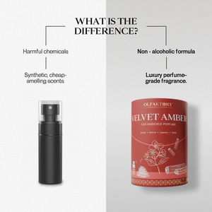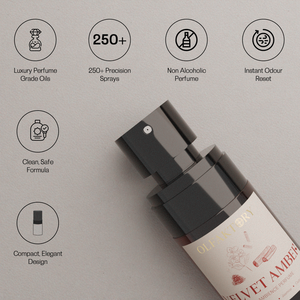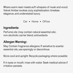 Velvet Amber is an intense car ambience perfume spray that brings rich amber, saffron warmth and clean woods into your space. The mist settles like velvet, smooth and sensual, leaving the air with a deep, lingering glow.